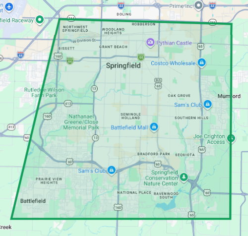 Our service area includes most of the Springfield, MO city limit and parts of Battlefield. If you live close to the shaded area below, do not hesitate to request a estimate or reach out via our contact form